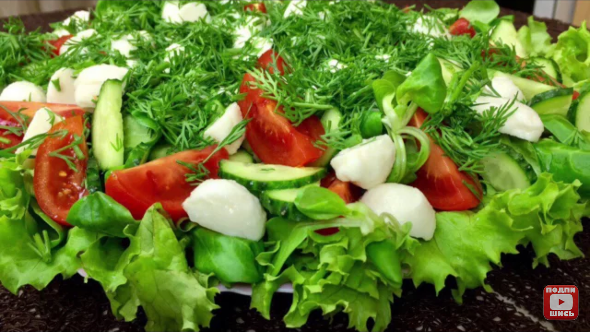 Вкуснейший салат, вполне способный заменить ЛЁГКИЙ ОБЕД! ИНГРЕДИЕНТЫ: Огурцы 200 гр. Помидоры 250 гр. Маш салат 300 гр. Листья салата 200 гр. Укроп 25 гр. Моцарелла 190 гр. Соль по вкусу Оливковое масло по вкусу В конце странички будет ВИДЕО этого БЛЮДА. А сейчас, ПОШАГОВЫЙ РЕЦЕПТ: 1. Нарезать листья салата. Распределить по блюду. Сверху добавить маш салат. 2. Нарежьте помидоры. Это следующий слой. Затем, очередь ОГУРЦОВ. 3. Нарезать моцареллу и равномерно распределить поверх овощей. 4. А теперь, украсим салатик нарезанным укропом. Добавим соль по вкусу. 5. Маш салат сочетается ТОЛЬКО с оливковым маслом. Его мы добавляем по вкусу... и, конечно же ложечка бальзамического уксуса!!! И ВСЁ!!! Великолепнейший, ВКУСНЕЙШИЙ салатик ГОТОВ!!! Приятного аппетита !!! Если вам понравилась ИДЕЯ, ставьте лайк и подписывайтесь на канал!!!