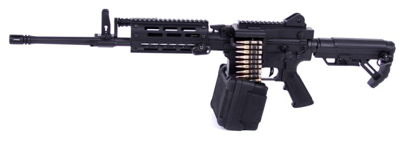 Наверное каждый хоть раз в бою сталкивался с проблемой, когда не вовремя кончились патроны в магазине. Однако не каждый хочет таскать с собой большой и тяжелый пулемет. Компания Golden Eagle решила эту проблему запуском новой линейки легких AEG пулеметов с нижним ресивером от AR-15. Корпус пулемета выполнен из алюминиевого сплава. Гирбокс версии 2. Спуск обычный. Магазин вмещает в себя 2600 шаров и питается от 4-х батареек типа ААА. Вес агрегата вместе с магазином всего 3794 грамма (как многие автоматы). Длина такого пулемета составляет всего ничего 780мм / 865мм. Визуально пулеметы из новой линейки похожи на огнестрельные прототипы легких пулеметов MCR и AMG-2 от FightLite Industries (подразделение американской оружейной компании ARES Defence Systems). И так цена… На официальном сайте производителя цена указана в 224,25 американских доллара, что в эквиваленте российской валюты всего 14355 рублей.