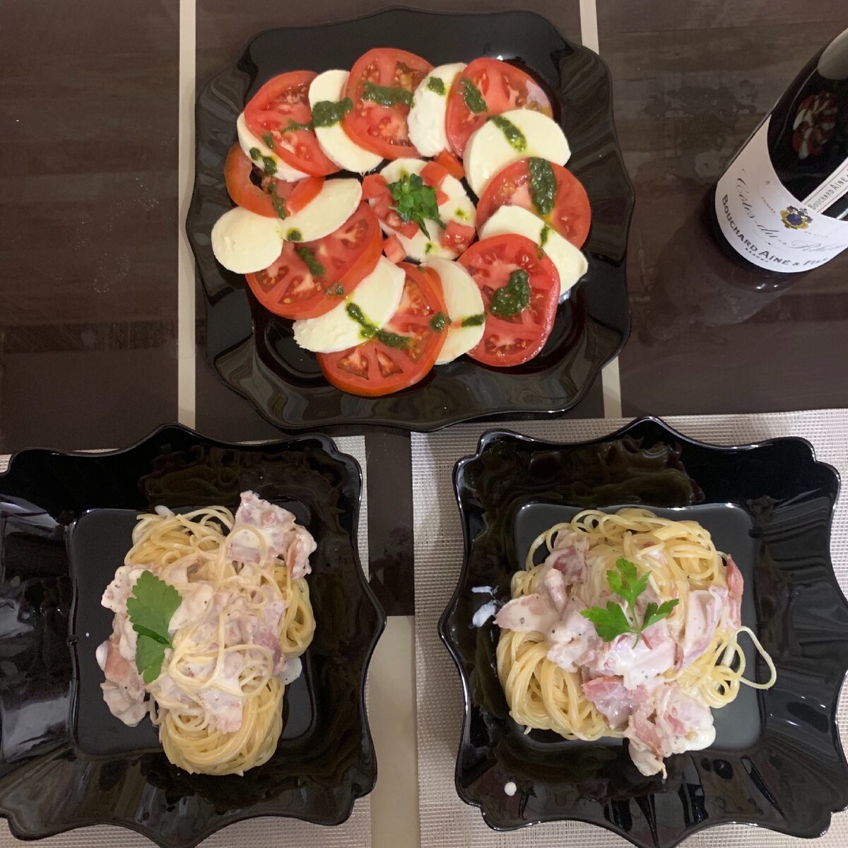 Один из очень красивых и романтичных вариантов проведения вечера с любимым человеком – это ужин в итальянском стиле. Обязательный атрибут нашего ужина по-итальянски будет паста и капрезе — лёгкая закуска из томатов, моцареллы, оливкового масла и базилика. Главное в приготовлении - правильное распределение времени. Сначала начинаем с приготовлении закуски и параллельно ставим кипятиться воду для спагетти. Капрезе 1 шаг Базилик измельчите с помощью блендера, чтобы получилась однородная консистенция и добавьте несколько ложек оливкового масла. 2 шаг Нарежьте помидоры и моцареллу толстыми кружочками 3 шаг Разложите помидоры и сыр на тарелку, чередуя друг с другом. Поперчите и подавайте вместе с соусом песто, украсив листиками базилика. Паста 1 шаг В кипящей воде варим спагетти 5 минут до состояния al dente, переодически помешивая, чтобы спагетти не слиплись. 2 шаг Пока варятся спагетти, в разогретой сковородке обжариваем кусочки бекона 3-5 мин. Главное не пересушите его