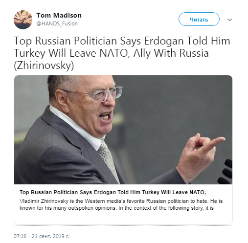 Владимир Жириновский, наверное, один из самых любимых российских политиков в западных СМИ из-за своих откровенных высказываний. В контексте следующего рассказа, где речь пойдет о Турции, интересно отметить, что Жириновский специализировался именно на турецких языке и литературе в Институте востоковедения МГУ. В эфире программы на российском телевидении Жириновский рассказал, что в будущем российско-турецкие отношения будут лчуше, чем российско-белорусские, российско-грузинские, российско-кыргызские отношения, а также заявил о том, что Эрдоган сказал ему с глазу на глаз, что Турция планирует оставить свое членство в НАТО. - Господин Жириновский, мне кажется, что около года назад вы говорили, что Турция выйдет из НАТО, и мы должны будем пригласить ее в ШОС. Кажется, вы были правы.