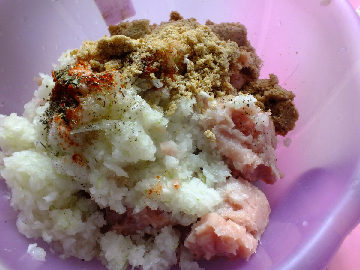 - Тщательно перемешать лук, фарш, яйца и специи.