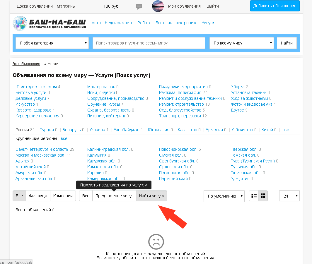 В разделе "Услуги" можно не только предлагать услуги, но и искать хорошего исполнителя! Просто добавьте новое объявление, при выборе укажите "Найти услугу". Подать объявление можно бесплатно. Нет ограничений по количеству объявлений. Доска бесплатных объявлений БАШ-НА-БАШ Сайт: https://bash-na-bash.com