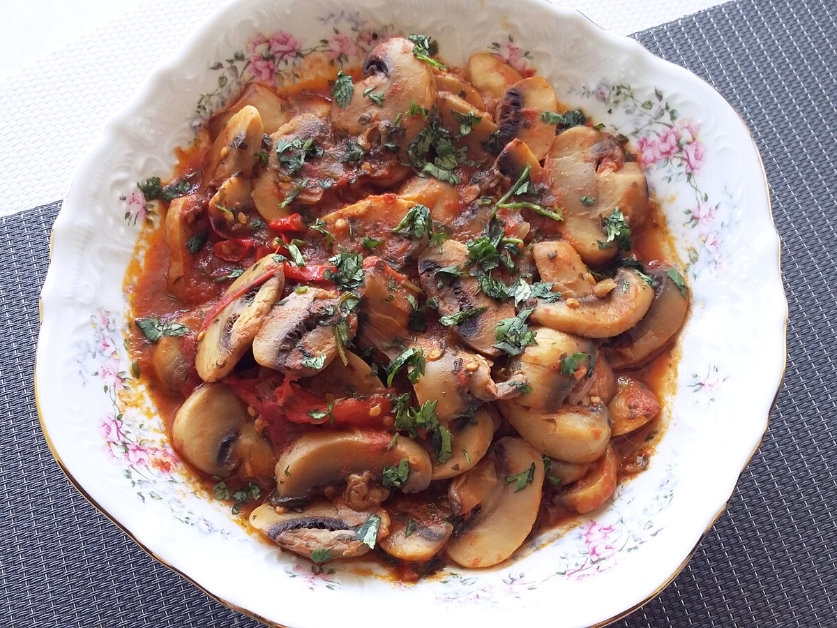Сегодня я хочу поделиться с вами рецептом гениальной закуски–тушеные грибы с помидорами. Потратив минимум усилий и затрат, вы получите прекрасное блюдо, которое подойдёт и на повседневный стол, и на праздничный. И, кстати, грибы можно использовать любые У меня были шампиньоны. Ингредиенты: ✔грибы–600 гр; ✔лук–2 шт.; ✔помидоры–2 шт.; ✔зелень; ✔стручковый перец; ✔соль; ✔сливочное масло для жарки. Приготовление. Очищенный лук нарезаем кольцами и отправляем в разогретую со сливочным маслом сковороду для обжаривания. Грибы нарезаем пластинами и отправляем к луку. Тушим до выпаривания жидкости. Помидоры нарезаем дольками, стручковый перец мелко рубим и добавляем к грибам. Обжариваем ещё пять минут, добавляем соль и измельчённую зелень.