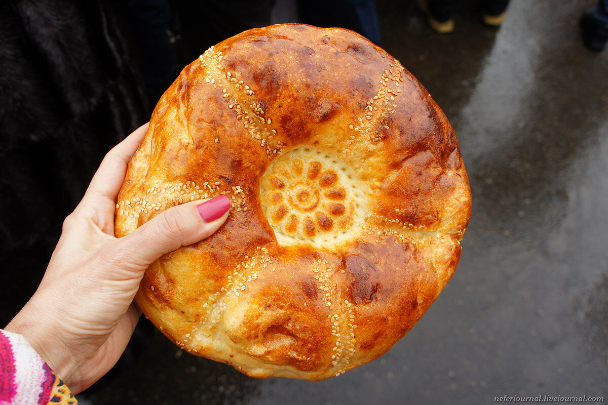 Настоящая узбекская лепешка хранится долго. Сухая лепешка даже через год пригодна для еды. Иногда их вешают на стену, как украшение. Штамп для нанесения узора в середину называется "чекич" или "чакич". Выглядит он так. ".