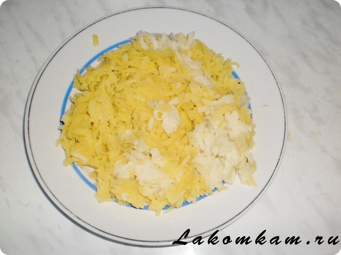 Приготовление салата с рыбными консервами. Отварные продукты чистим и трём на тёрке. Салат выкладываем слоями, промазывая каждый майонезом: картофель,