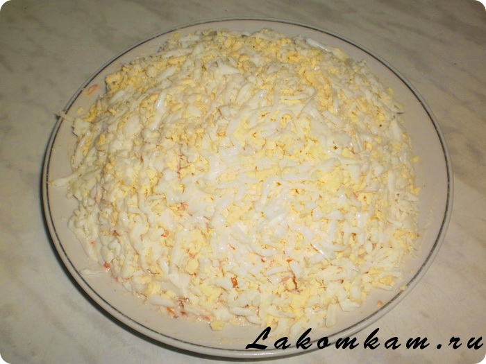 Ингредиенты: отварной картофель — 2 штуки; отварная морковь — 1 большая; отварные яйца — 3 штуки; рыбные консервы — 1 банка; майонез.