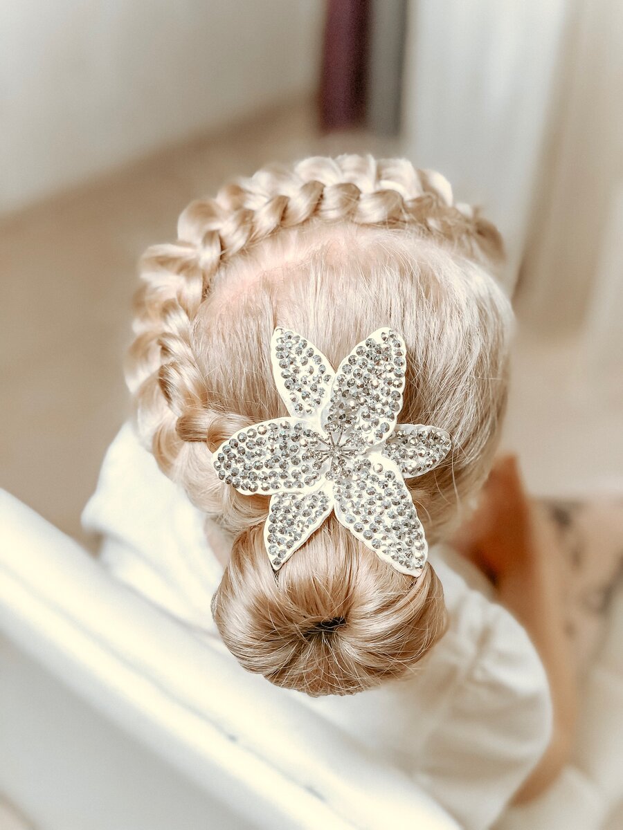 Переходим ко второй части волос. Плетём французскую косу, отделяем три пряди и начинаем плести. Правую прядь опускаем вовнутрь под среднюю, левую под нашу правую, которая теперь средняя и так далее, правая под среднюю, левая под среднюю ! Заплели несколько рядом одной рукой держим косу, второй начинаем растягивать уже заплетенную косу. Аккуратно вытягиваем крайние волосы из каждого ряда, растянули до желаемой ширины, растягиваем следующий ряд и так далее. Возвращаемся к косе, плетём дальше. Заплели ещё несколько рядов, растянули. Доплели косу до конца длины, растянули, закрепили резинкой. Возвращаемся к пучку. Оставшиеся волосы, которые не в
