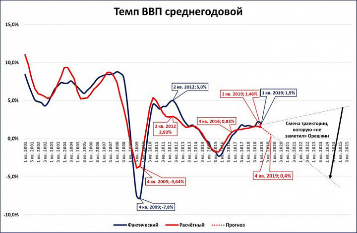К числу отечественных организаций, прогнозирующих рост ВВП менее 1% в 2019 году (АКРА, ЦБ, ИНП РАН), присоединяются и международные. Так Организация экономического сотрудничества и развития снизила свой прогноз с 1,4% до 0,9%. Ниже подробности. Наш прогноз Весной мы в своём прогнозе ВВП на 2019 год ожидали роста на 0,8% (см. "Экономика на грани нервного срыва"). Позже мы пересмотрели прогноз в худшую сторону, до 0,4%...0,5%. В частности, это зафиксировано в материале «Об излишнем оптимизме Орешкина» К нам присоединились… АКРА, ЦБ, ИНП РАН Позже к нам присоединился первый из «авторитетных» институтов – АКРА (см. https://www.kommersant.ru/doc/4040291) . Затем в это своеобразный клуб «ВВП меньше 1%» вступил ЦБ. Он пересмотрел свой прогноз с 1…1,5% на 0,8…1,3%, то есть допустил рост ВВП ниже 1%. В прогнозе ИНП РАН тоже сделан прогноз о росте ВВП в 2019 году на 0,8%. ОЭСР А сейчас, в сентябре, в клуб вступила Организация экономического сотрудничества и развития (ОЭСР). Она объявила, что