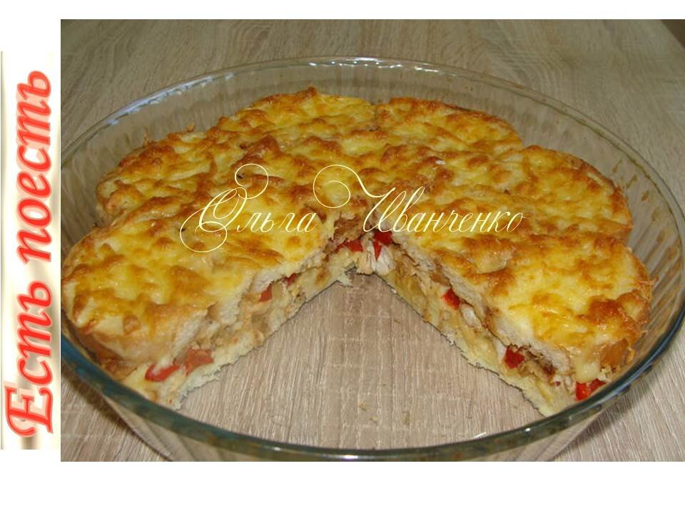 Очень быстрый пирог без хлопот! Хрустящий сверху, мягкий внутри. Вкусный и сытный. Подходит, как вариант, для быстрого завтрака или ужина. Хорош как в горячем, так и в холодном виде. Начинка может быть любой, в зависимости от наличия продуктов. Ингредиенты: багет - 250 г, яйца - 3 шт, мука - 30 г, сметана - 200 г, сыр - 150 г, соль, специи по вкусу. Начинка: филе курицы - 1 шт.(350 г ), лук - 1шт., перец болгарский - 1 шт., соль, специи - по вкусу, растительное масло для жарки - 1-2ст.л. Делаем начинку. Куриное филе режем мелкими кусочками, лук и перец нарезаем кубиками. Далее всё это обжариваем на растительном масле. Добавляем специи и солим. Даём начинке остыть. Готовим заливку. Смешиваем яйца, соль, сметану, муку, соль и специи по вкусу. Дно и стенки формы(у меня d=24 см) смазываем маслом и выкладываем туда кусочки багета, пустоты тоже заполняем маленькими кусочками. Сверху посыпаем половиной тёртого сыра. Наливаем немного заливки. Распределяем начинку и снова наливаем заливку.