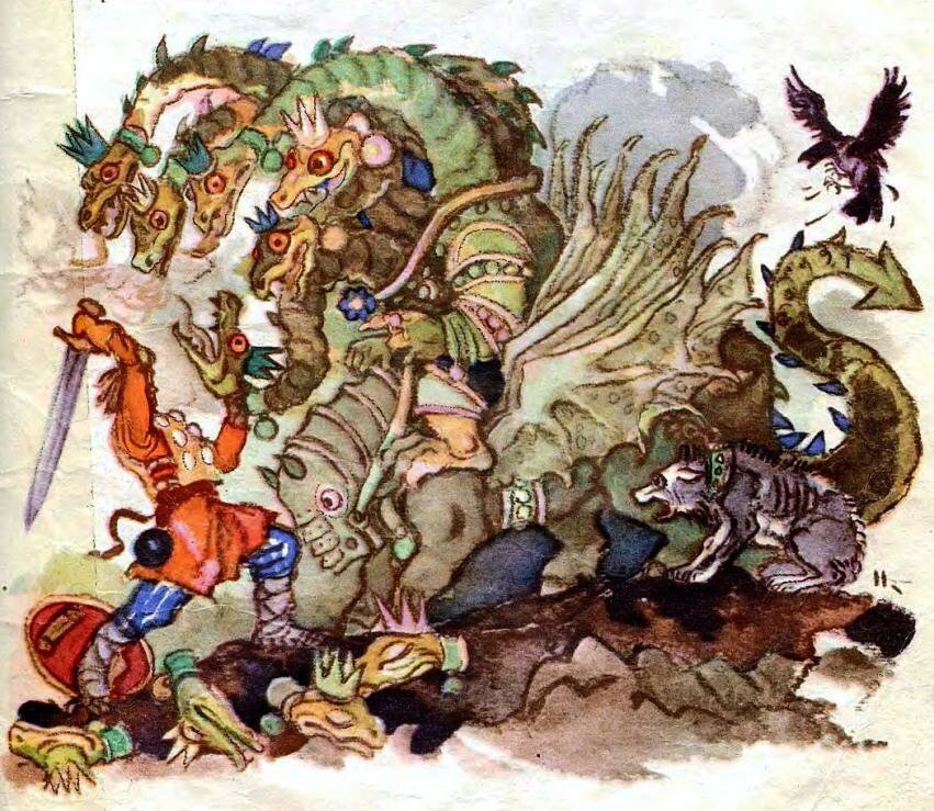 После того давай рубить ему головы. Сшиб все до единой! Туловище на мелкие части рассек и побросал в реку Смородину.