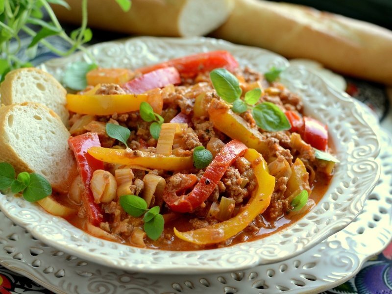 Как и многие мясные блюда кубинской кухни, тушеные овощи с фаршем и креольским соусом отлично сочетаются с белым рисом, с желтым рисом или с вареной лапшой. Зеленые оливки придают тушеным овощам и фаршу яркий экзотический привкус. Состав: 1 столовая ложка оливкового масла 1 зеленый сладкий перец, очищенный и мелко порезанный 1 средняя луковица, мелко порезанная 450 грамм нежирного говяжьего фарша ½ стакана креольского соуса ¼ чайной ложки тмина ¼ чайной ложки соли ¼ чайной ложки черного молотого перца ¼ стакана зеленых оливок, нарезанных колечками ¼ стакана золотистого изюма Способ приготовления: Нагрейте масло в большой глубокой сковороде или кастрюле на огне выше среднего. Добавьте болгарский перец и лук, обжаривайте, пока лук не станет мягким. Затем добавьте фарш. Деревянной лопаткой разомните фарш и хорошенько перемешайте с луком и перцем. Добавьте креольский соус и тмин, хорошенько перемешайте. Уменьшите огонь, посыпьте солью и перцем. Накройте крышкой и тушите около 30 минут, ино
