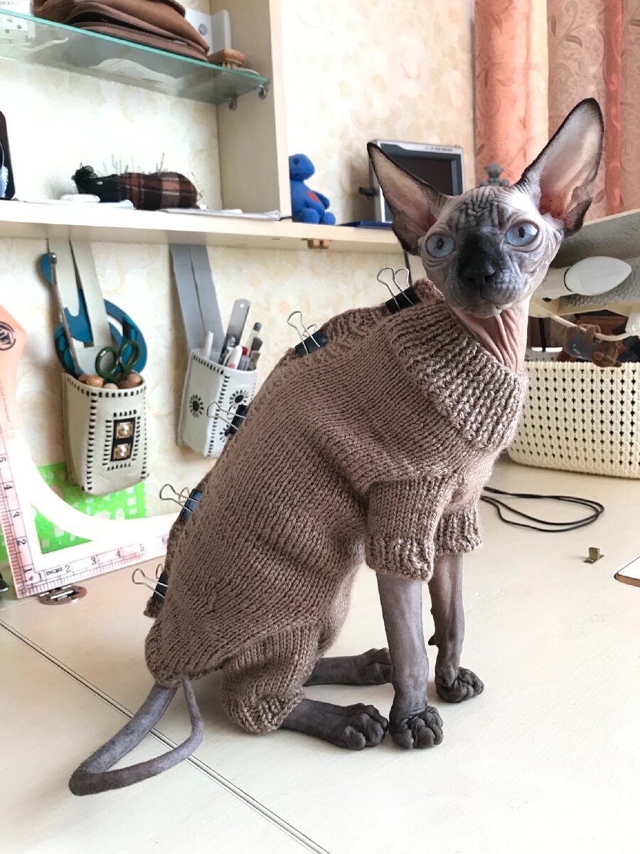 Кто-то использует её для красоты. Кто-то защищает питомца от холода. Как вы уже догадались, у меня кошка породы Канадский сфинкс. Возможно, в холодное время года в квартире ей бывает холодно, но мы используем одежду для неё в качестве защиты от загрязнения самой кошки. Да, да, вы все правильно прочли. Тем, у кого есть сфинксы, точно знаю, что они безумно пачкаются из-за того, что потеют. Где лежат, там оставляют (в моём случае) коричневые пятна, в белой одежде их обнимать не стоит, тоже могут остаться пятна, приходиться чаще купать котю. Я одеваю одежду ей перед сном. Это лучший способ, серьёзно. Одежду я не покупаю, шьём сами. Она растёт очень быстро и кофточки ей всегда малы. Так что шьём из чего есть😊