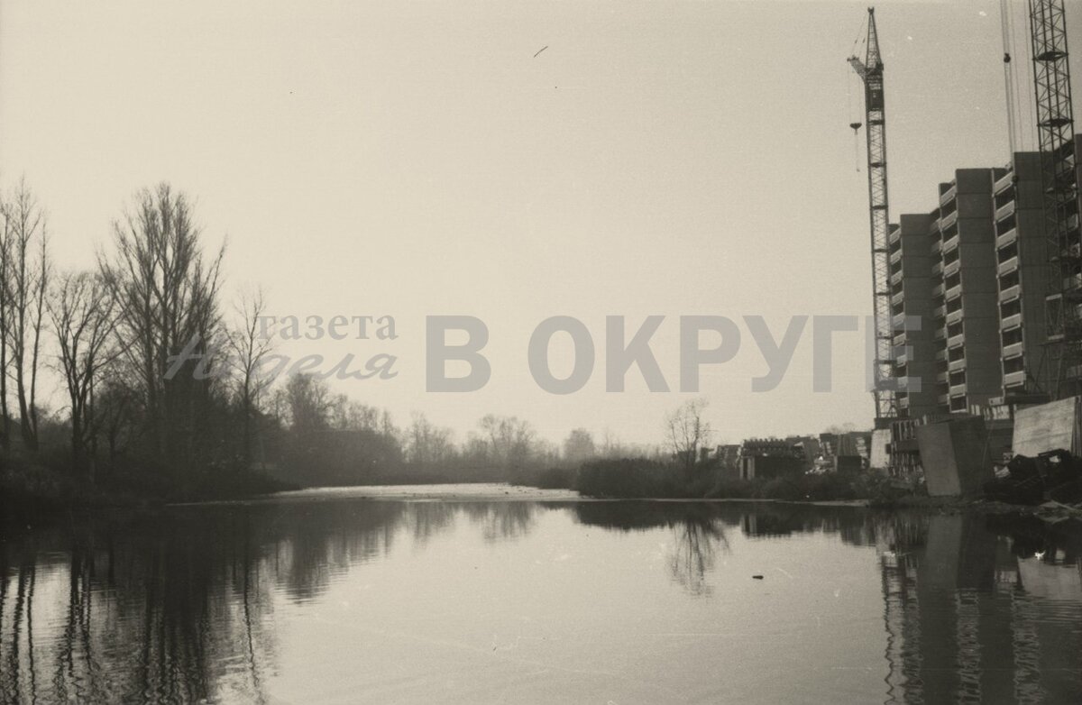 Яуза. Вид с пешеходного моста на ул. Щербакова. Справа - строительство дома № 1 по ул. Щербакова (одна из трёх шестнадцатиэтажек), конец 80-х