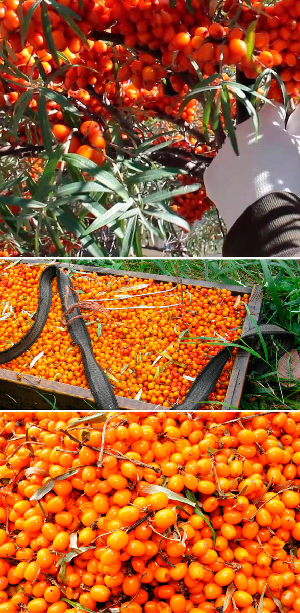 Ягоды проще собирать, когда они полностью поспеют, но не переспеют. В этом случае сохраняются все полезные вещества. Кустарник созревает с последнего летнего месяца по середину осени. Сроки сбора зависят от сорта. Раннеспелые собираются уже в начале августа. Однако некоторые (к примеру, сорт Чуйковская) поспевает к концу этого месяца. Позднеспелые разновидности в средней полосе России собирают в 20-х числах сентября. В южных регионах — еще позже. Понять, что ягоды поспели, можно по их насыщенному окрасу. К тому же, они становятся тугими и легко лопаются. Если плоды собираются для изготовления масла, лучше подождать еще несколько недель. Конечно, от этого большинство ягод размягчится, потеряет какое-то количество витамина C. Однако выход жидкости будет лучше. Некоторые садоводы рекомендуют собирать облепиху после начала заморозков, чтобы плоды легче отрывались. Это можно делать только в облачную погоду. На солнце ягоды оттаивают, кожура во время отряхивания куста отделяется и остается