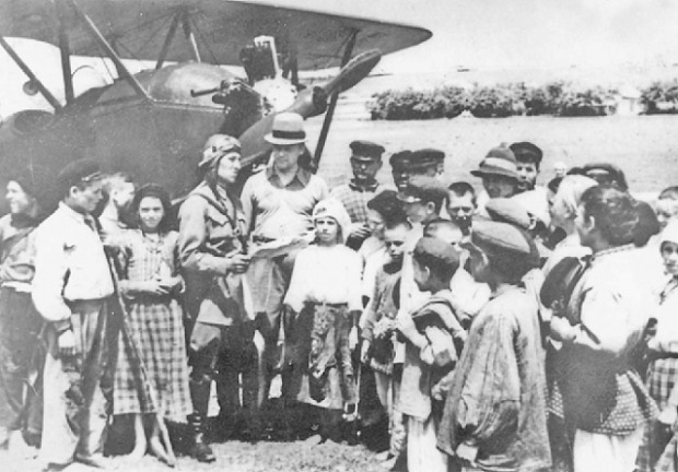 Representatives of the young generation of Bessarabia (Moldova) present flowers to fighters of the Red Army