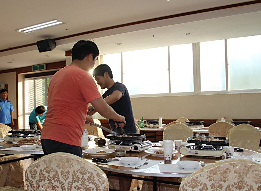 Мне бы в голову не пришел этот вопрос, если бы обстоятельства не сложились таким образом, что жить нам в Южной Корее пришлось не в каком-то крупном или даже не очень крупном корейском городе, а там, где иностранцев практически не бывает. Я уже писала в самом начале своего рассказа о том, что жили мы все время пребывания в этой стране в ..... доме престарелых. Расположен этот дом вне какого-либо населенного пункта - стоит себе со всеми своими постройками где-то в лесу. И ближайший к нему мало-мальски приличный населенный пункт - город Йоджу, который и городом-то стал всего пять лет тому назад. До этого был обычной корейской деревней. Программа нашего пребывания была составлена таким образом, что в самом доме для престарелых мы только завтракали и пару раз ужинали, причем один из этих двух ужинов был приготовлен специально для нас - нам жарили барбекю (см. верхнее фото), что, конечно же, бабушки и дедушки, т.е. постояльцы этого дома, не едят. В общем, нам вполне хватило питания в д