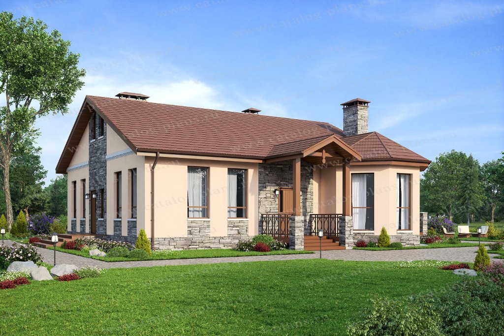 Проект одноэтажного дома из кирпича. Такой дом имеет ряд преимуществ по сравнению с двухэтажным, например, на возведение потребуется существенно меньше времени, в нем отсутствуют лестницы, которые опасны для маленьких детей и неудобны для людей пожилого возраста, а так же экономия в процессе эксплуатации из-за меньших расходов за отопление. Общая площадь проекта 165 квадратных метров, и он включает в себя все необходимое для постоянного проживания. Несущие стены заложены из кирпича и отделаны штукатуркой и искусственным камнем. Проектом предусмотрен монолитный железобетонный фундамент плита и монолитные перекрытия. Кровля чердачная с металлочерепицей. Основной вход в дом организован через крыльцо. Так же имеется дополнительный вход через террасу и отдельный вход в бойлерную. Недалеко от главного входа разместилась гардеробная. Далее мы можем пройти в прихожую, которая связана при помощи большого проема с гостиной. Гостиная и кухня-столовая в данном проекте решены в едином пространстве.