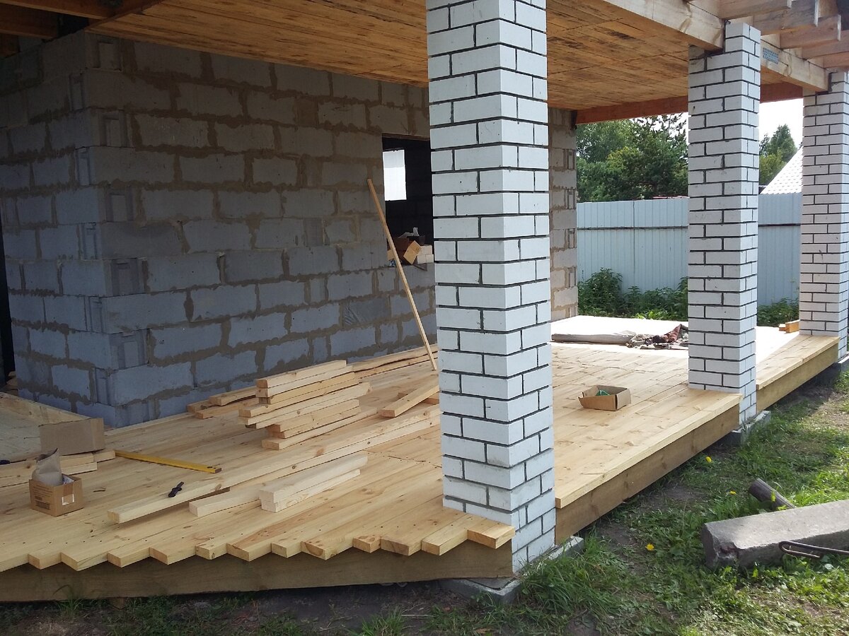 Построив баню всегда хочется, чтоб места для отдыха было больше и имелся выход на свежий воздух. Для этого отлично подходит терраса. Как ее сделать, что для этого нужно, попробуем описать в этой статье. Для балок мы использовали 3-х метровый брус сечением 100*200 мм. С одной стороны для опоры балок использовали расширение фундаментных тумб у столбов, с другой стороны балка крепилась анкерами и усиленными уголками к фундаменту бани. Между собой балки также крепились усиленными уголками и простыми "саморезами". Балки обязательно необходимо пропитать антисептическим раствором. Расстояние между соседними балками не более 600 мм, при необходимости можно положить утеплитель. Пол, изначально планировалась "палубная" доска, но по причине не маленькой площади террасы (более 30 м.кв.) стоимость получалась внушительная, было принято решение покупать не строганную 3-х метровую сосновую доску сечением 45*150 и 45*100 мм и электрорубанок (получилось намного дешевле) для самостоятельной подготовк
