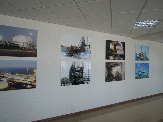 На стенах фотографии производства и компаний входящих в группу "Акрон"