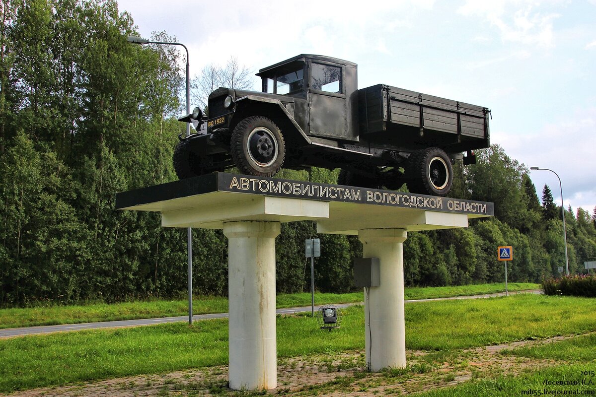 В Вологодской области, у трассы М8, недалеко от Грязовца, стоит автомобиль-памятник ЗИС-5. На высоком постаменте имеется лаконичная надпись "Автомобилистам Вологодской области". ЗИС-5, пожалуй, один из самых часто встречающихся автомобилей-памятников. Это, в общем-то, логично: выпустили их достаточно много, в том числе большую часть после войны, а на Уральском автозаводе последнюю модификацию этого автомобиля под индексом УралЗиС-355 выпускали аж до 1958 года, и эксплуатировались некоторые экземпляры до 1980-х годов. Вологодский автопамятник был выпущен как раз на УралЗИСе, это уже послевоенная модификация. На постамент автомобиль был установлен в 2003 году, но уже в августе 2013 года машину пришлось отправить на реставрацию. В ходе восстановительных работ была починена прогнившая платформа, а также отремонтирована кабина, в которой ветер и хулиганы побили все стёкла. Постамент тоже обновили и в октябре 2013-го, как раз ко Дню автомобилиста, ЗИС-5 вновь занял своё место. К сожа