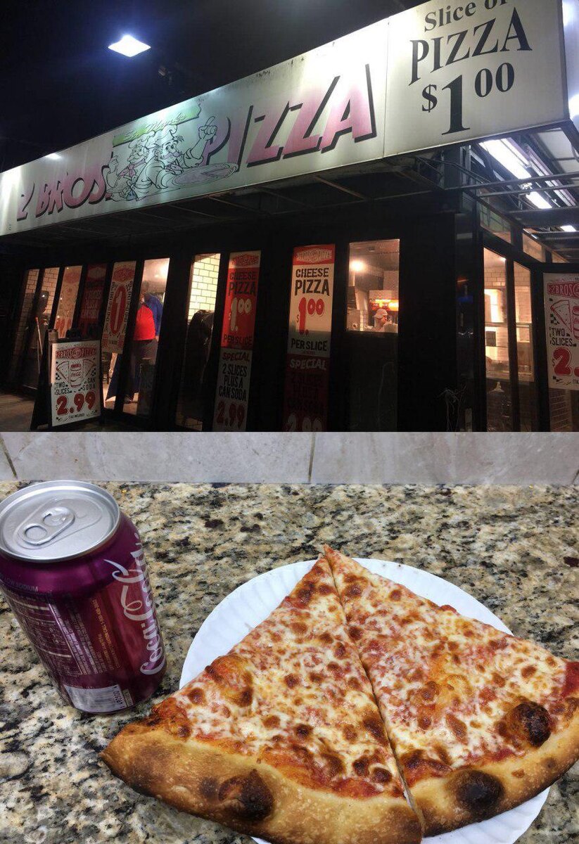 Одна из самых популярных забегаловок в Нью-Йорке - это пицца 🍕. 1 кусок пиццы за 1$ и банка колы за 1$, но при покупке баночки колы и двух кусков добрые кассиры сделают скидку и за все придется заплатить только 2.99$ (около 170 рублей). Очень дешево по меркам Америки, да и поесть такое можно) Найти такие забегаловки можно практически на каждом углу, а зарабатывают они исключительно на большом потоке людей.