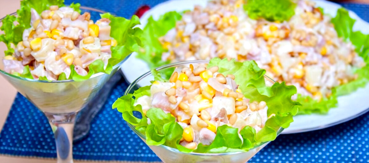 Приветствую вас, мои дорогие читатели. Хочу познакомить вас сегодня с рецептом очень вкусного и быстрого в приготовлении салата "Буржуй". Ингредиентов потребуется немного, но вкусовые качества будут великолепны. Что нам понадобится для приготовления: Куриный окорочок копченый - 2 шт. Кукуруза консервированная - 250г. Ананас консервированный - 250г. Майонез - 100г. Орешки кедровые - 30г. Листья салата - для украшения Соль - по вкусу Перец черный молотый - по вкусу Как приготовить: 1. Куриный окорочок кладем на разделочную доску и отделяем мясо от кости. Вместо куриных окорочков можно использовать куриную грудку, но тогда мясо будет немного суховатым. Нарезаем небольшим кубиком и перекладываем в глубокую миску. 2. Консервированный ананас вынимаем из баночки, отцеживаем сироп, он нам не пригодится. Ананас нарезаем мелким кубиком и отправляем в миску к нарезанному мясу. 3. В миску к салату отправляем консервированную кукурузу. 4. Салат заправляем майонезом, добавляем соль, перец по вкус
