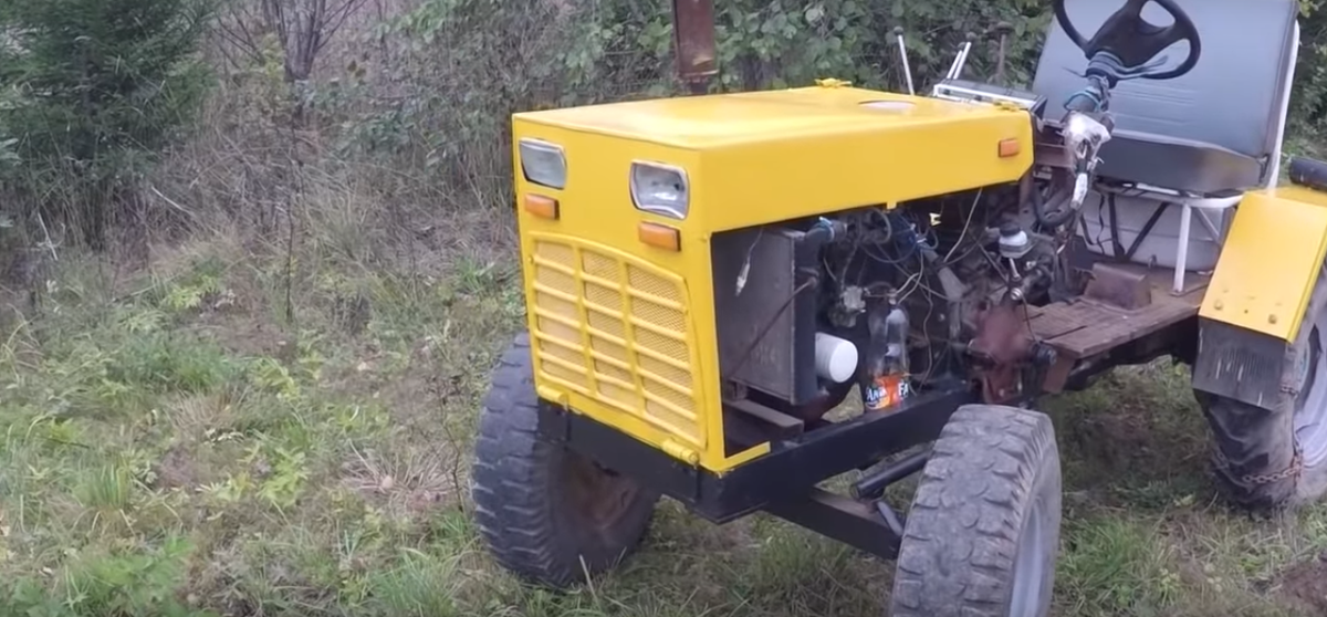Всем привет, в этой статье я покажу самодельный трактор, который купил в соседней деревне. Кто-то говорил, что это хлам и помойка, зря купил, вези на металлолом, кто-то меня поддержал в покупке, но и те другие задаются вопросом: “Какая цена у этого трактора, из чего состоит, да и вообще как это чудо передвигается?”. И сегодня я сделаю для вас статью-обзор. Сразу скажу, что трактор немного изменился, мы немножко немного его сразу подкрасили, заменили сиденье, которое была с деревянной спинкой на сиденье от моего Volkswagen Transporter, потому что туда скоро приедет в салон сиденья от Audi A8, это будет в следующих статьях. Так вот снял капот, ну и в принципе сразу начнем. Буду примерно называть стоимость деталей которые увидел на Авито, ну что потом сложить всё и получить какую-то сумму, а потом уже сравнить её с реальной стоимостью. Значит что мы имеем: движок от Жигули тройки, карбюратор, четыре цилиндра. Пока езжу на фанте. Топливный бак от лодки. Уже его несколько раз промыл, всё