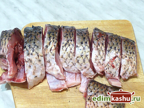 Сегодня у меня именно такой вариант — голова сазана и ещё я взяла крайние кусочки от разрезанной на порционные куски рыбы. Кусочек, который был рядом с головой и кусочек хвоста. В общей сложности у меня получилось 400 гр. Остальную рыбу я подготовила для запекания. Ингредиенты: