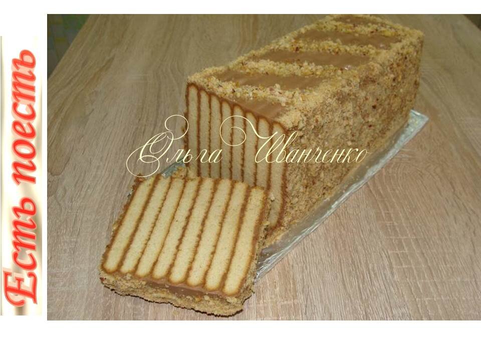 Рецепт быстрого и оригинального тортика без выпечки. Готовится просто, съедается быстро, выглядит эффектно. Вкусен и в холодном виде, прямо из холодильника - рассыпчатый, и, когда постоит в помещении - становится мягким и нежным. Ингредиенты: печенье - 1 кг, какао порошок - 2 ст.л. с горкой, сметана (у меня 26 %) - 400 г, молоко сгущёное(варёное) - 1 банка, орехи обжареные - 50 г. Делаем крем. Смешиваем сметану со сгущёнкой и какао. Смазываем печенье кремом, сверху кладём ещё печенье, также смазываем, и третье печенье. Делаем ещё одну такую "башенку" и соединяем их кремом между собой. Ставим так, чтобы печенья стояли вертикально. Между "стопочками" тоже помещаем крем. Подробнее смотрите в видеоролике. Обмазываем торт кремом. Бока обрабатываем обжаренными перемолотыми орехами или печеньем. Украшаем по желанию. Убираем торт в холодильник для пропитки. Достаём торт и режем его на порционные кусочки.