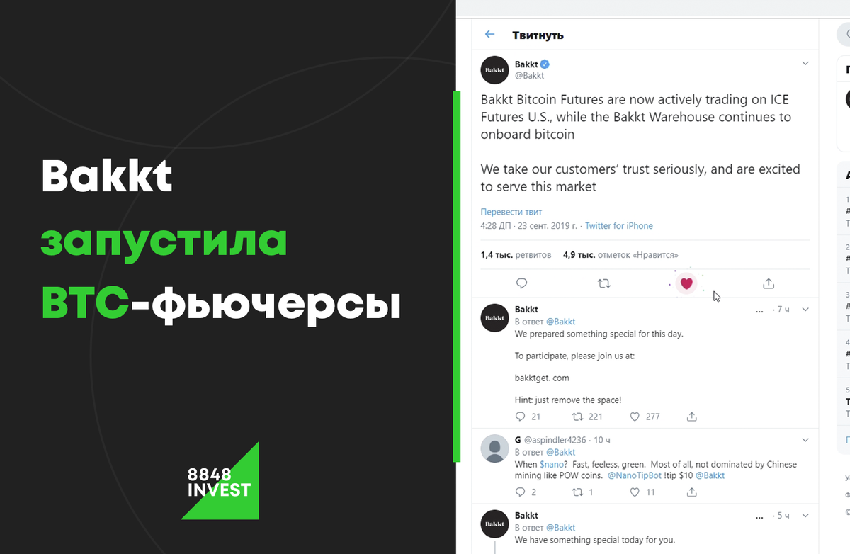 Криптовалютная платформа Bakkt объявила о старте торгов поставочными BTC-фьючерсами на фондовой бирже Intercontinental Exchange (ICE), что позволит институциональным инвесторам открывать позиции в криптовалюте на площадке с полной регуляцией. Новый инструмент также даст возможность оценить объем спроса на криптовалютные деривативы со стороны крупных трейдеров. Доступ к платформе Bakkt останется свободным до июня следующего года, после чего трейдерам потребуется подписка. Фьючерсы Bakkt предполагают «физическую поставку». По истечении срока действия договора покупатели получат BTC, в то время как расчет по фьючерсам, доступным с 2017 года на чикагской бирже CME, идет наличными, что по сути, превращает их в ставку на цену криптовалюты. Другой фичей фьючерсных контрактов ICE на BTC стал срок их действия, который равен одному дню. Согласно спецификациям ежедневного контракта, BTC поставляется через два банковских дня после завершения контракта, что позволит компаниям и отдельным пользоват
