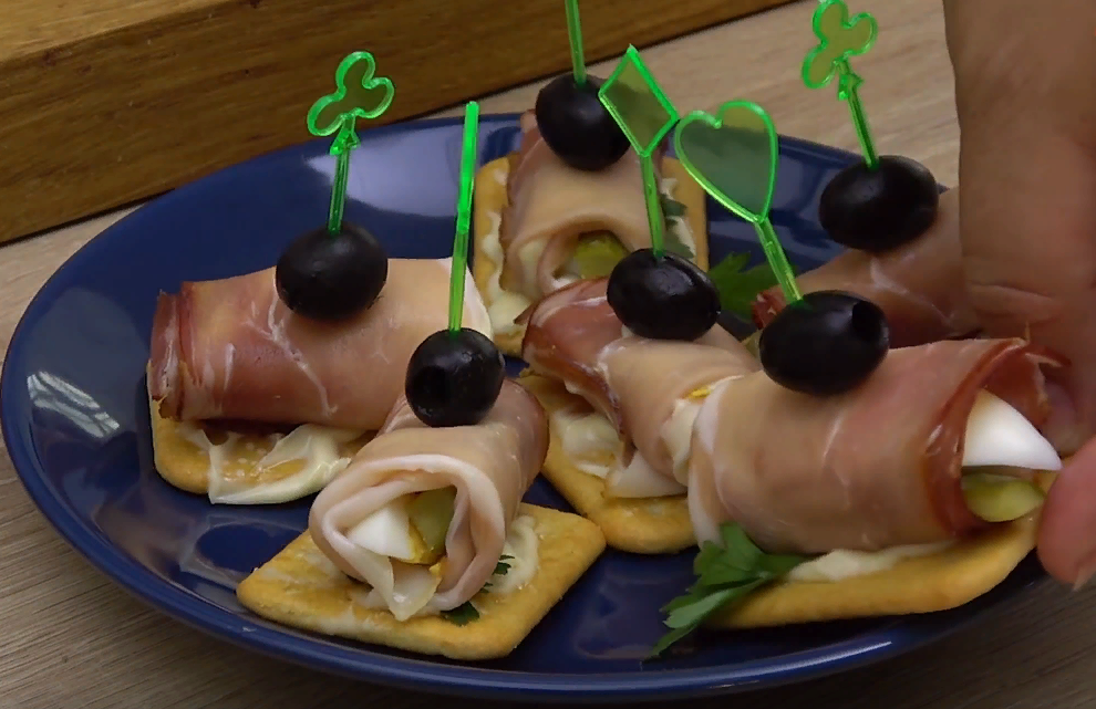 Маленькая, вкусная и красивая закуска на вашем столе обязательно привлечёт внимание гостей. При этом, в ней используются самые доступные продукты, а получается такая милота! И кстати, канапешка выйдет крайне питательной! Но не только на праздничный стол, а и на семейный ужин, маленькое домашнее событие вашей семьи можно подать такую закуску! На полоску бекона нанесите майонез с чесноком или крем-сыр. Так же намажьте его тонким слоем на солёный хрустящий крекер. Порежьте солёные огурчики и отварные яйца - по 2 штуки. Теперь, на подготовленный бекон выложите по брусочку огурчика и кусочку отваренного яйца, заверните рулетиком. Подготовьте маслины или оливки, достаньте зубочистки или палочки для канапе. На печенья выложите листики зелени. Остаётся собрать закусочку. На шпажку наденьте маслинку, проткните ею рулетик и закрепите его на крекере. Переложите сытный мини-бутерброд на яркую, красивую тарелку и подавайте! А какое вкусное закусочное канапе готовите вы?