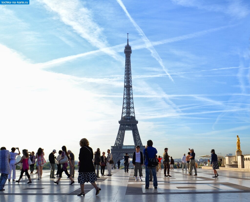 Давайте начнём от главной достопримечательности Парижа - Эйфелевой башни. Также обратите внимание, что на парижском небосводе просто живого места нет от следов самолётов. Это касается не только этой фотографии, но и многих других ниже. Туристический поток в городе просто бешеный.