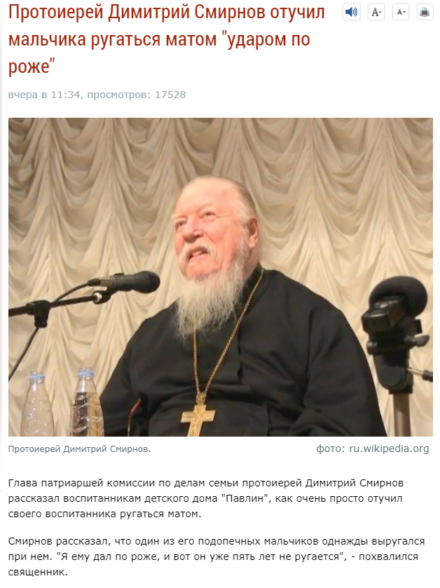 Наивный он дедушка. Юноша не перестал материться, он просто не матерится при Смирнове. а вот в его отсутствие материт всех и вся и в первую очередь самого попа, желая тому поскорее почить в бозе самым жестким образом . Ибо самое лучшее чему может научить РПЦ - это лицемерие и вранье. Чем богаты тем и рады. Кстати вопрос к лингвистам, является ли слово "рожа" цензурным? И не пора ли господину Смирнову наконецто переболеть заболеванием "рожа", а точнее рожистым воспалением. Пусть по воспаленной руке бы побил, матерясь от боли и высокой температуры.. Попы не матерятся?? Их просто доселе не видели в таких условиях, когда они будут матерится. Скоро увидят. Возможно даже самого Д.С. Я бы обрадовался его словооборотам, ибо они у него скорее всего весьма изысканные будут и это стоило бы записать в блокнотик.