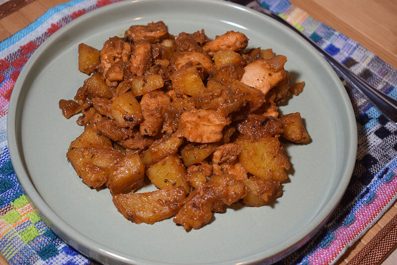 КБЖУ на 100 грамм блюда: Б - 5,4 г; Ж - 6,8 г; У - 10,7 г; 123 Ккал. Ингредиенты: - филе куриного бедра без кожи - 270 г; - репчатый лук - 150 г; - картофель - 330 г; - чеснок - 8 г; - томатный соус - 25 г; - соус Терияки 20 мл; - соль по вкусу; - паприка, черный молотый перец, сушеный томат по вкусу; - растительное масло - 15 мл. Способ приготовления: Обжариваем лук и чеснок Лук и чеснок моем, чистим, измельчаем (лук не слишком мелко, а чеснок пропускаем через пресс или натираем на мелкой тёрке). После обжариваем на растительном масле до лёгкой золотистости 5 - 7 минут на умеренном огне. Обжариваем картофель Картофель моем, чистим нарезаем небольшими кусочками и добавляем в сковороду к луку. Обжариваем до небольшой золотистой корочки на умеренном огне (+- 7 минут). Добавляем курицу Филе бедра режем на небольшие кусочки, добавляем соль, специи (паприку, черный молотый перец, сушеную зелень или любые другие ваши любимые специи), томатный соус (или пюре томатов), соус терияки и хорошо
