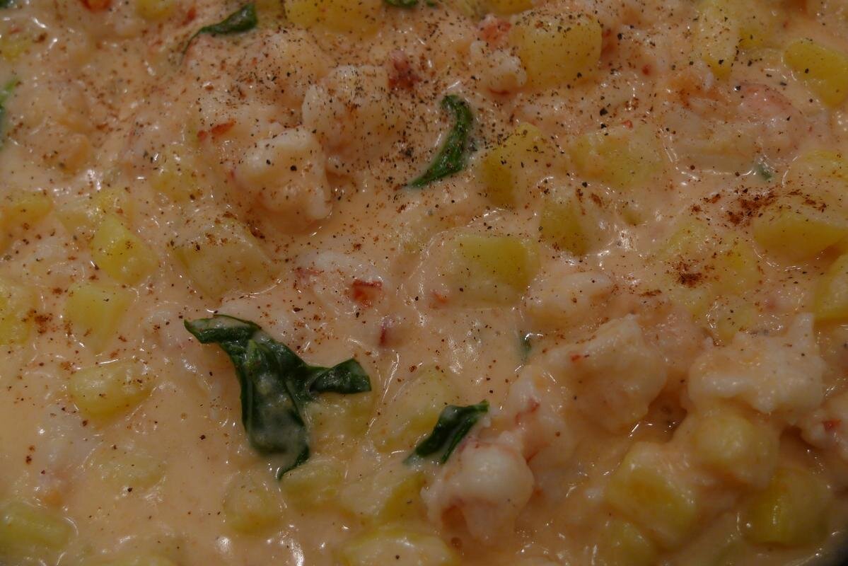Но, как и все другие - очень просто, быстро и красиво Ингредиенты: Тигровые креветки 4 шт., картофель 1-2 шт., сливочное масло 15 г, молоко 60 мл, мука 1 ст.л., тёртый сыр 150 г; соль и перец по вкусу. У нас, конечно, тут бОльшие порции, на несколько человек. 1. Креветки очистить и нарезать пополам. Картофель почистить и порезать кубиками 1 см. 2. Картофель отварить. Креветки пожарить в сковороде на сливочном масле. Добавить картофель к креветкам. 3. Посыпать мукой и хорошо обжарить. Добавить молоко и тщательно размешать до густоты. Первое фото как раз с этого этапа, я бы, если честно, сожрала бы уже и так, просто ложкой :) Но!!!! 4. Положить в формочку из бумаги или фольги, посыпать тёртым сыром. Запекать 5 минут до золотистой корочки в разогретой заранее духовке. Аки попросила сделать температуру 200 градусов Рецепт: Аки Накагава