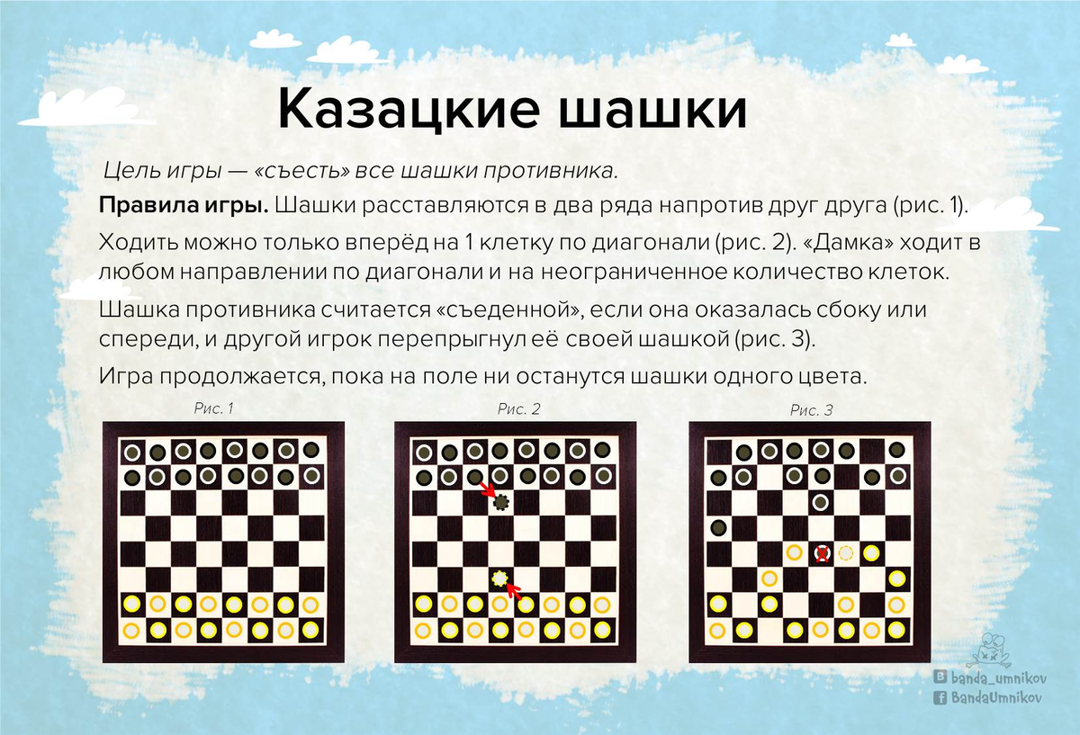 Совсем другие шашки. Однообразные правила быстро наскучивают непоседам. А какие вы знаете необычные игры с шашками? Делитесь в комментариях! Казацкие шашки Цель игры - «съесть» все шашки противника. Шашки расставляются в два ряда напротив друг друга (рис. 1). Ходить можно только вперёд на 1 клетку по диагонали (рис. 2). «Дамка» ходит в любом направлении по диагонали и на неограниченное количество клеток. Шашка противника считается «съеденной», если она оказалась сбоку или спереди, и другой игрок перепрыгнул её своей шашкой (рис. 3). Игра продолжается, пока на поле ни останутся шашки одного цвета. Понравилось? Ставьте лайк и подписывайтесь на канал! Родители рекомендуют эти подарки на класс или в садик. Дети будут в восторге! Путеводитель по каналу «Банда умников»