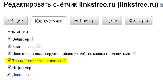 Если я Яндекс Метрикой я уже столкнулся и знал как решить вопрос, то про Гугл Аналитикс такой информации не было. Спасибо случаю, наткнулся на статью про изменение отказов в Гугле. Надежда, спасибо! Начнем с известного. Яндекс Метрика. Изменение показателя отказов в Яндексе Тут нам нужно добраться до кода счетчика и поставить одну галочку. После код счетчика обязательно перезалить на сайт. Заветная галочка тут: После изменения времени стала совсем радужная картина. Ага, пользователи как посещали так и посещают только одну 1.2 страниц в среднем... Поскольку все же большинство приходит за тем, что запрашивало, то такая красота получилась: Настройка отказов в Гугл Аналитике Тут всё проще. Берем и меняем установленный код на такой <script type="text/javascript"> var _gaq = _gaq || []; _gaq.push(['_setAccount', 'UA-XXXXXXX-1']); _gaq.push(['_trackPageview']); setTimeout("_gaq.push(['_trackEvent', '15_seconds', 'read'])",15000); (function() { var ga = document.createElement('script'); ga.t