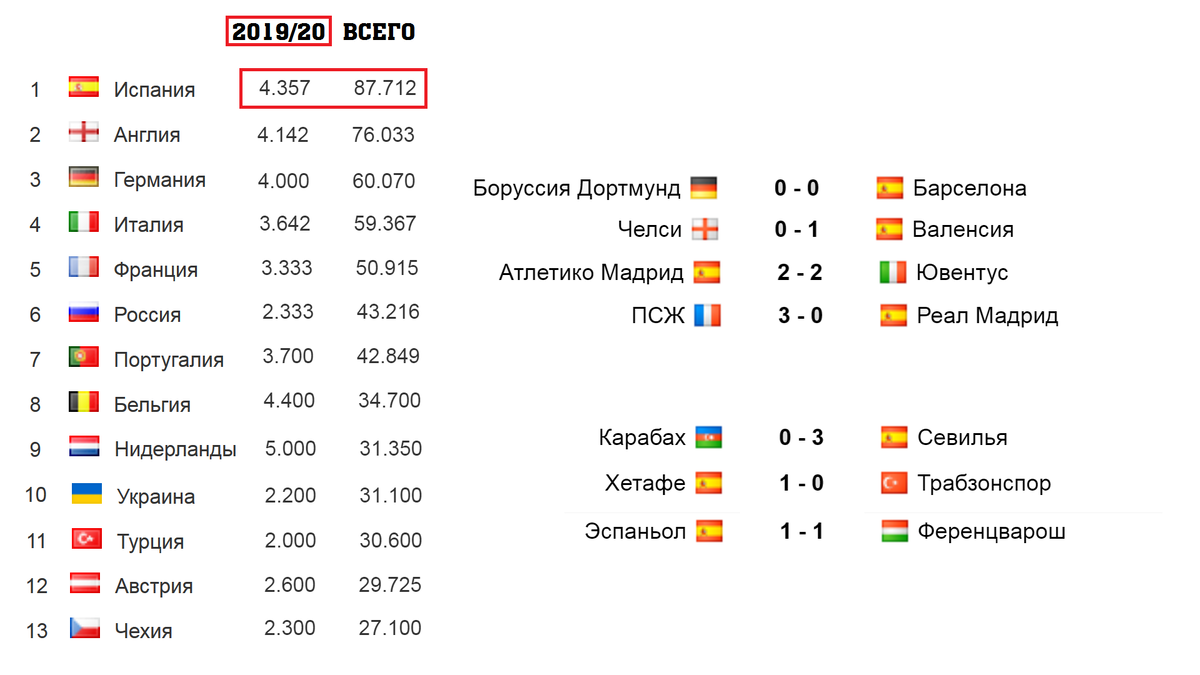 Презентуем таблицу УЕФА. Также мы решили собрать в одном выпуске результаты каждой страны. Вот, что получилось. Прошлый сезон испанские клубы начали с 4 побед, а Реал в первом туре выиграл 3:0 у Ромы. На этот раз "галактикос" уступают 0:3, а у испанской ассоциации 3 победы (+1,3). у представителей Англии 3 выигрыша. Ничьи также приносят очки в копилку, хоть мы их не называем (+1 балл в рейтинге). Немецкие участники добыли 3 триумфа. 6 игр состоялось в Германии, и только Лейпциг был вынужден отправиться в столицу Португалии за победой (+1). Как известно, у Италии осталось 6 команд. И только двум удалось выиграть: Наполи и Роме ( +0,9 ) Из пяти французских команд три очка взял только ПСЖ (+0,9) Россия на 6 месте. Осталось у неё 4 клуба. В Лиге Европы - безобразие (+0,5). Португалия дышит в спину шестой ассоциации. У этой страны сохраняются 5 команд из пяти. Португальцы сыграли на две победы (+0,8). Бельгийские коллективы сыграли достойно, кроме Генка, который уступил