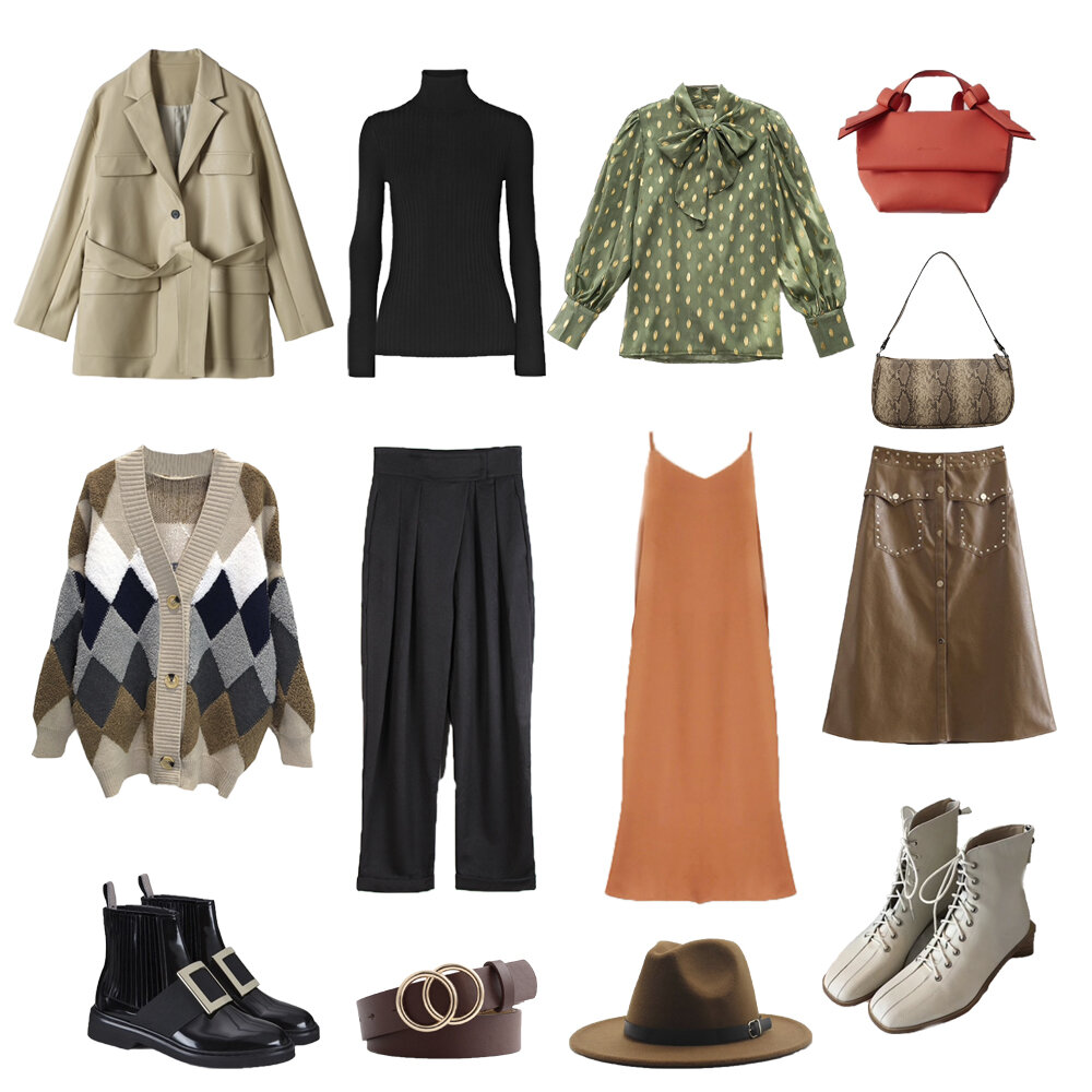 В капсулу входит: жакет из эко-кожи в молочном оттенке (2500р ссылка тут), кардиган оверсайз с узором из ромбов (1000р ссылка тут), базовая водолазка (1000р ссылка тут), оранжевое платье в бельевом стиле (900р ссылка тут), блуза с бантом (750р ссылка тут), широкие брюки с защипами (2000р ссылка тут) и юбка из эко-кожи (1100р ссылка тут).