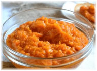 Берём 3 - 4 крупные моркови, 2 головки репчатого лука, 3 - 4 яблока Семеренко, растительное масло, соль, сахар по вкусу. Морковь очистить, нарезать довольно крупными кусочками и обжарить в растительном масле до мягкости, затем обжарить лук, порезанный кольцами, и яблоки нарезанные на четвертинки и очищенные. Все вместе пропустить через мясорубку, сдобрить по вкусу солью и сахаром, хорошо перемешать и прогреть ещё раз на сковороде. Следить, чтобы икра не пригорела. Подавать как закуску охлаждённой, выложив горкой в салатник. Берём 4 ст.л сливочного масла, 1,25 стакана муки, 1,5 ч.л пекарской порошка, 2 яйца, 3/4 стакана сахара, 1/2 стакана молока, 1 ч.л ванилина цедра 1 лимона. Масло расплавить и слегка остудить, после чего смешать с молоком ( водой ). В отдельной посуде яйца с сахаром взбить до образования пены и добавить ванилин и лимонную цедру. Объединить все жидкие компоненты в одной посуде. Муку хорошо перемешать с пекарским порошком и добавить к полученной жидкой основе. Тесто ме