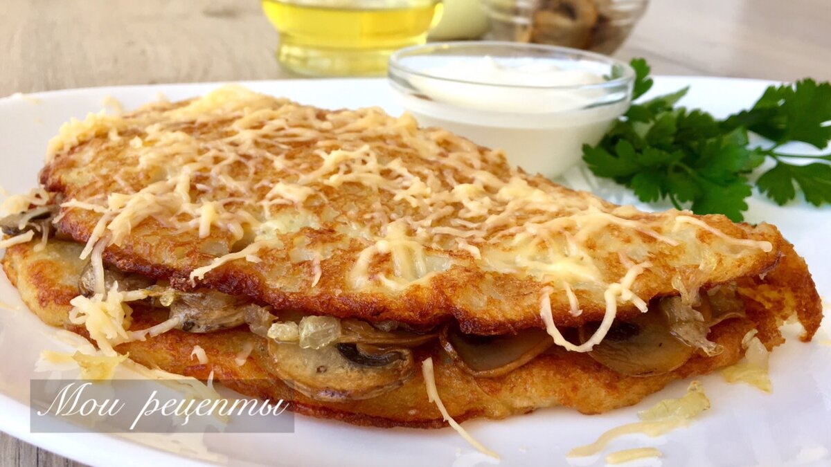 Сытный, вкусный, большой драник с начинкой! Съедаешь один - и уже сыт! Начинку можно приготовить по своему вкусу: грибы или мясо. Пошаговый видео рецепт можно посмотреть на моём YouTube канале "Мои рецепты": Ингредиенты: Картофель 2-3 шт Лук 1/2 шт Мука 1 ст.л Соль 1/3 ч.л Твёрдый сыр 20г Растительное масло для жарки 50г Начинка: Шампиньоны 100г Лук 1/2 шт Соль по вкусу Чёрный молотый перец по вкусу Нарежьте грибы, выложите на сухую сковородку. Обжаривайте пока не испарится вся жидкость. После испарения жидкости добавьте растительное масло, соль, чёрный молотый перец и обжаривайте до готовности периодически помешивая. Грибы обжариваем примерно 5-7 минут. Мелко нарежьте лук. Выложите на сковородку с растительным маслом, и обжаривайте до золотистого цвета. Картофель нужно очистить и натереть на мелкой тёрке для картофеля. Картофель содержит в себе крахмал, поэтому сразу же натираем в него репчатый лук, чтобы картофель не потемнел! Лук натираем так же на мелкой тёрке. Затем добавим с