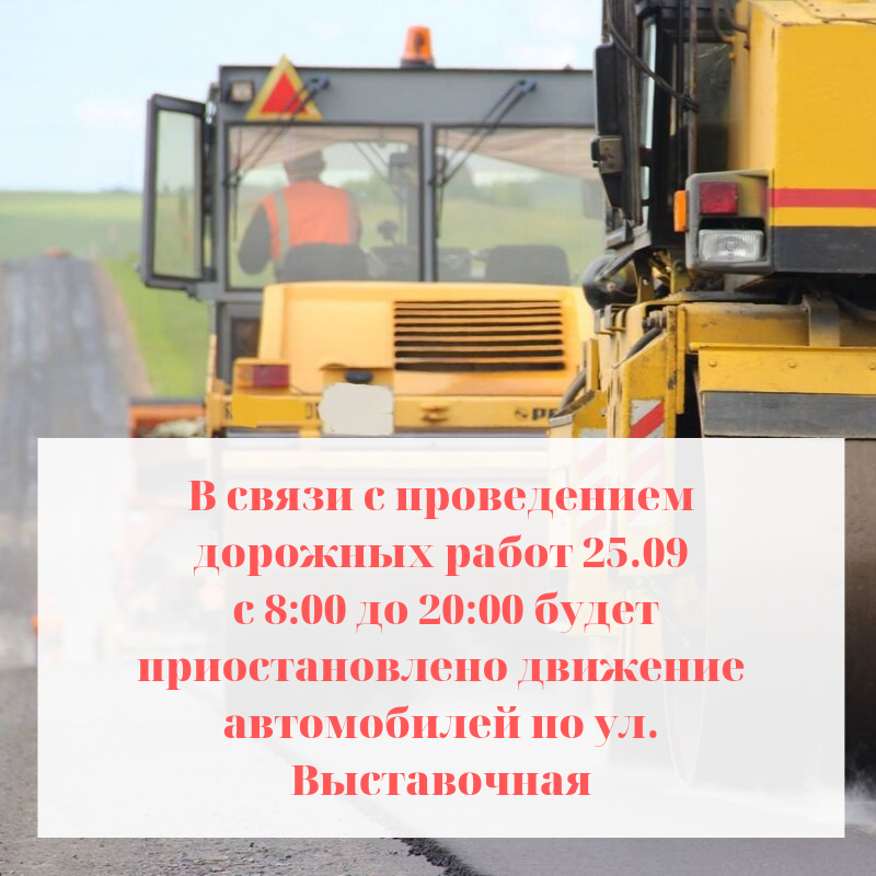 В связи с проведением дорожных работ 25.09 с 8:00 до 20:00 будет приостановлено движение автомобилей по ул. Выставочная