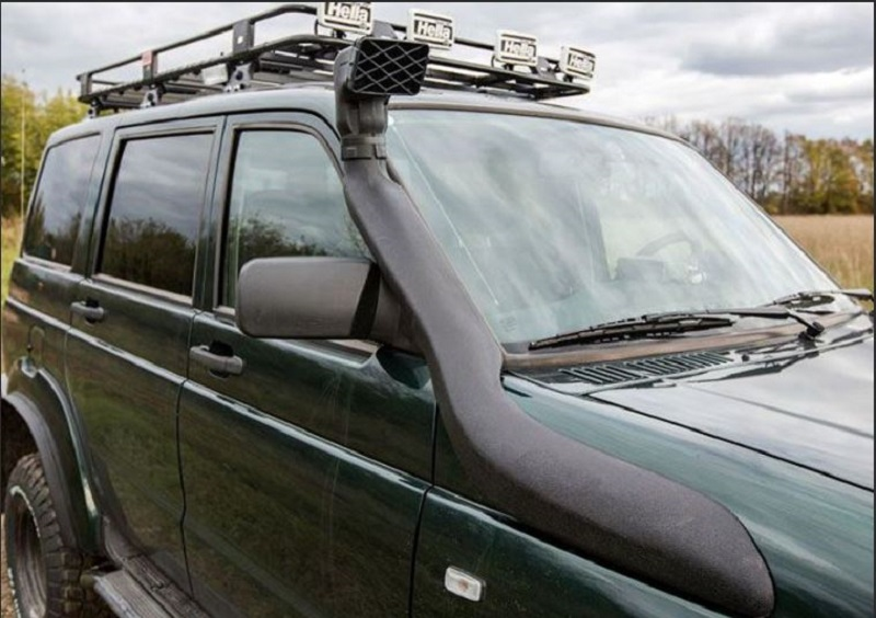 - Шноркель ударостойкий (аналог SAFARY) УАЗ Патриот (РБ) – специализированный воздухозаборник силовой установки, который при качественной и правильной установке исключает вероятность захвата воды в топливно-воздушную смесь. Преодоление различных водных препятствий сопровождается большим разбрызгиванием воды и попаданием ее в подкапотное пространство, за счет чего и может возникнуть столь нежелательный захват воды мотором. Установка же шноркеля исключает такие вероятности, т.к. забор воздуха осуществляется значительно выше самого капота. Аксессуар к тому же отлично дополняет образ настоящего внедорожника.