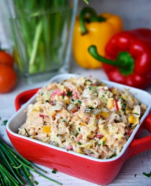 Салат с китайской лапшой, курицей, кукурузой, пекинской капустой и сладким перцем - это отличная закуска для вечеринок! Его выполнение является невероятно простым и быстрым. Ингредиенты: Куриное филе – 400 гр.