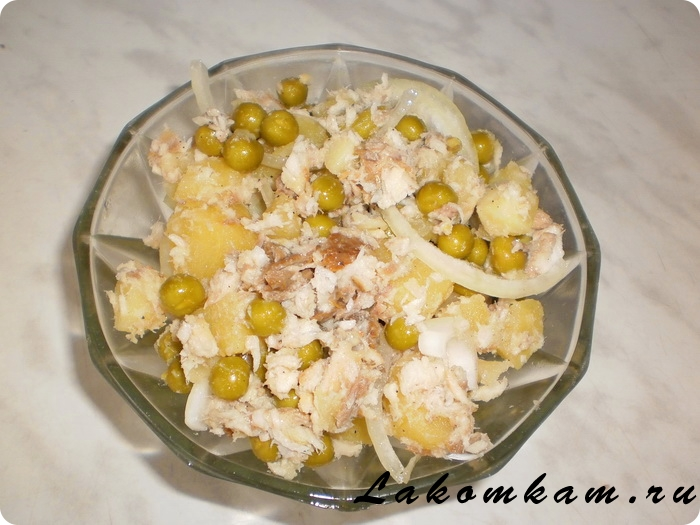 Соединяем в глубокой ёмкости: рыбу, картошку, горошек и лук.