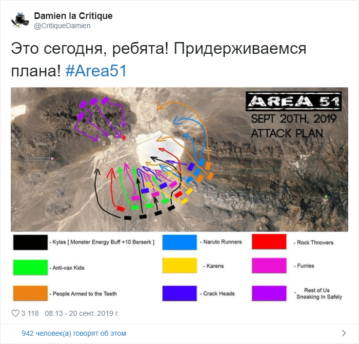 Сегодня 20 сентября 2019 года, а значит, это день X для тех, кто собирается штурмовать «Зону 51» — сверхсекретную американскую военную базу, где по слухам проводят эксперименты над пришельцами. Как? Зачем? Обо всём этом мы уже писали, можно ознакомиться здесь. Итак, разберёмся, что же происходит на самом деле? Штурм не начался, да и американское правительство решило поумерить пыл желающих, пригрозив штрафом в 1 тысяцу долларов каждому, кто попытается прорваться на объект, как сообщает Газета.ру. Но люди вокруг «Зоны» потихоньку собираются. Настало 20 сентября — день штурма «Зоны 51» Штурм планировали начать в 4.20 после полудня, то бишь в 2.20 21 сентября по московскому времени, и люди уже стягиваются на позиции. Здесь и здесь можно посмотреть трансляцию с места событий. Были и другие. Их, кстати, смотрело много русских, и люди периодически донатили. Люди начинают собираться вокруг зоны У некоторых шапочки из фольги и плакаты с призывами освободить инопланетян Mick Akers https://www.