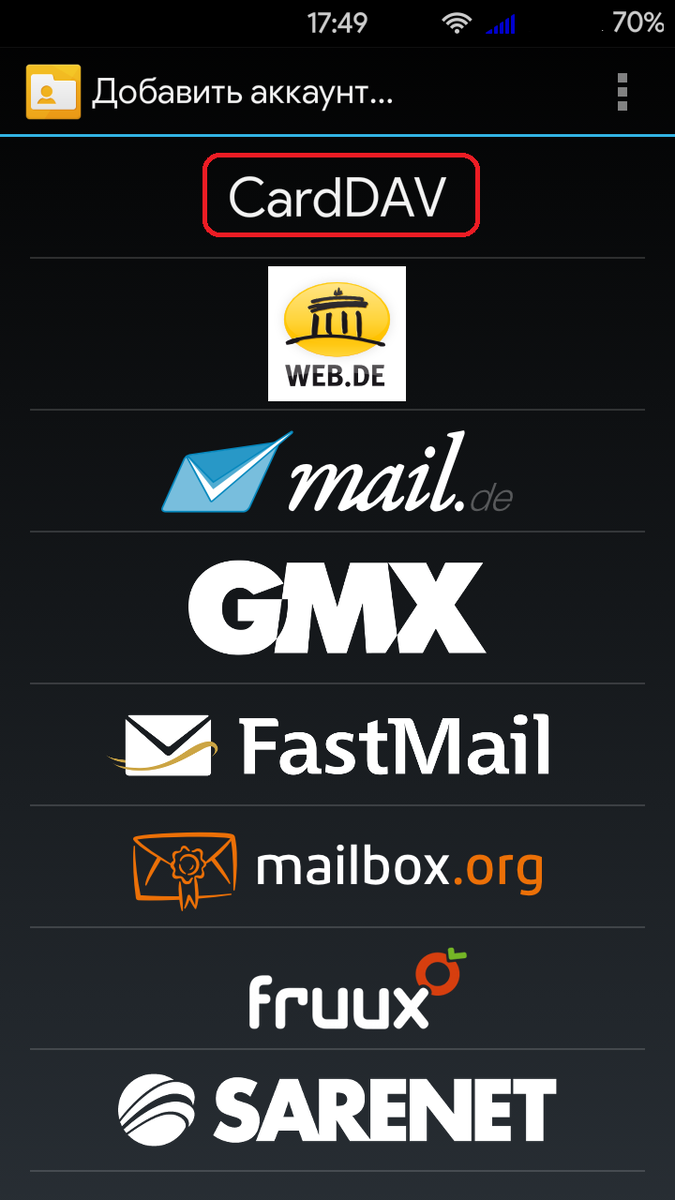 Думаю многие испытывают неудобства связанные с Гугл сервисами на старых аппаратах с андроидом, потребление памяти, тяжеловатые обновления, ну и известен такой момент после синхронизации как плохая детализация фото на контактах, которое впрочем можно устранить если нажать на контакт и подождать пока прогрузится фото, но это не удобно если таких контактов очень много. Как альтернативную программу для синхронизации я использую CardDav-Sync, которая работает с хранилищем яндекса. Достаточно один раз настроить в телефонной книге все контакты и фото и после синхронизировать - и последующие восстановления не потребуют лишних трудозатрат, фото восстанавливаются в начальном варианте, а программу можно отключать до следующего использования или синхронизации вручную, её можно отключить и она не будет висеть в фоне потребляя ресурсы. Скачать её можно в открытом доступе используя поиск или на сайте 4pda. Итак приступим... После установки и при первом запуске видим такое окно - Нажимаем CardDav,
