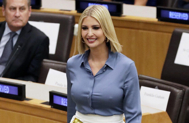 У Иванки Трамп были очень напряженные выходные, посещая римскую свадьбу дизайнера пала Миши Нону, поэтому, возможно, у нее не было времени, чтобы упаковать бюстгальтер, направляясь в Нью-Йорк на Генеральную Ассамблею Организации Объединенных Наций. Она определенно не носила его под своей тонкой голубой блузкой в сентябре. 23 пока она смотрела выступление своего отца Дональда Трампа. В результате у 37-летней девушки произошел сбой в гардеробе, что дало посетителям со всего мира возможность увидеть очертания ее сосков через рубашку. Весь деловой вид Иванки для UNGC был далек от великолепных платьев, которые она носила в Риме. Для самой церемонии она надела широкое платье цвета шампанского с накидкой и золотым поясом. Затем для приема она переоделась в одно из платьев своей мамы Иваны Боб Маки, которые 70-летняя первая жена Дональд