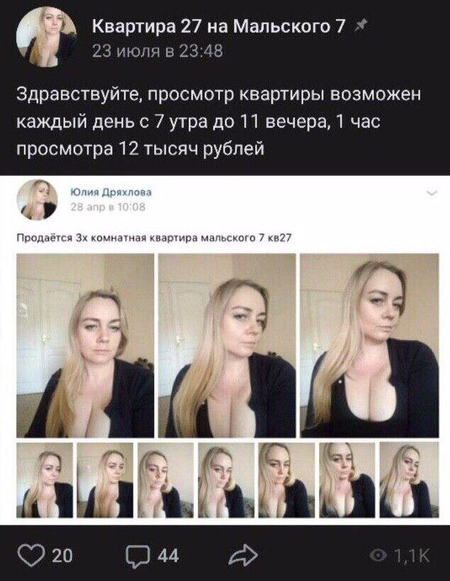 Поскольку системой запрещены объявления по тематике интимных услуг, находчивая жрица разместила объявление о своих услугах под видом продажи трехкомнатной квартиры. «Продается 3-х комнатная квартира 27 на ул. Мальского, 7. Просмотр возможен с 7 утра до 11 вечера, 1 час просмотра 12 тысяч рублей». Объявление было подкреплено несколькими фото с глубоким декольте. Но главное — комментарии пользователей к объявлению. — А можно все квартиры посмотреть? — А если я одной из комнат не буду пользоваться, можно как–то подешевле? — А за просмотр чулана отдельно доплачивать? — За такие деньги можно пару часов дом с бассейном и сауной смотреть.