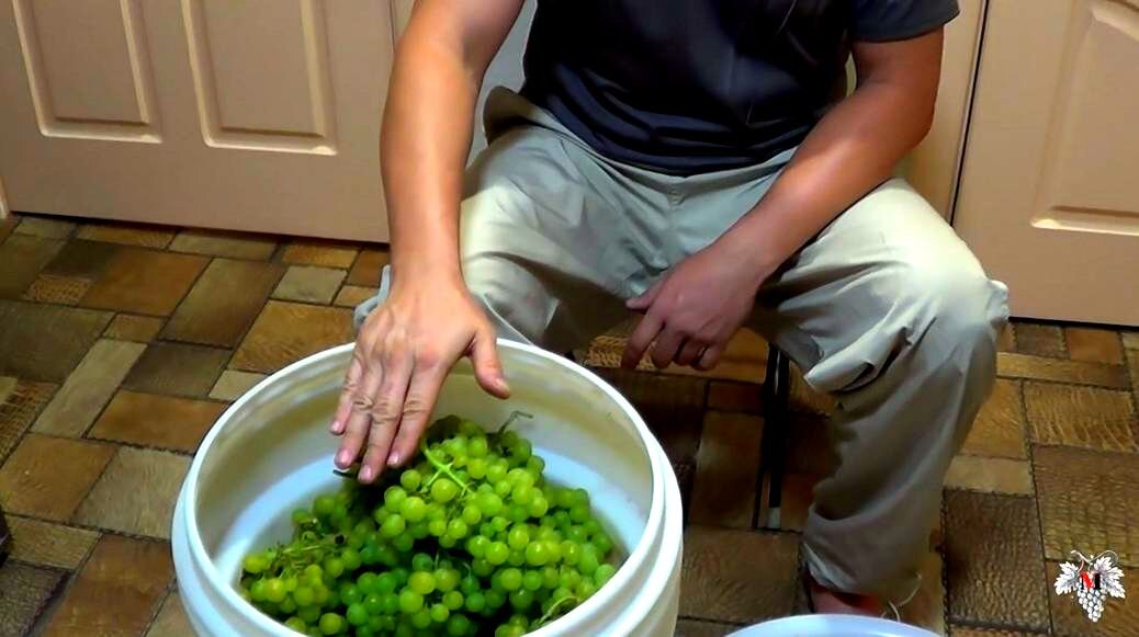 Сегодня я расскажу Вам, как приготовить сухое вино в домашних условиях. Вино я буду делать из сорта винограда Мускат Янтарный. Для этого я предварительно собрал 23 килограмма данного сорта винограда. Для изготовления сухого вина из белых сортов винограда мне необходимо в первую очередь измерить его сахаристость, она составила 22-23 Брикс. Далее необходимо отделить ягоды винограда от гребненожки. Данный процесс занимает довольно длительный промежуток времени, но без этого нельзя, так как гребненожка может окисляться и давать неприятную горечь во вкусе. При изготовлении белых вин самое главное это не дать окислиться суслу. К данному окислению приводит длительное взаимодействие сусла с кислородом. Вино из окисленного сусла полностью теряет мускат и имеет посредственный вкус. После отделения ягод от гребненожки их необходимо передавить. Делать это можно с помощью специального пресса, либо как это делали в старину с помощью чистых ног. Поможет мне передавить ягоды винограда с помощью ног, м